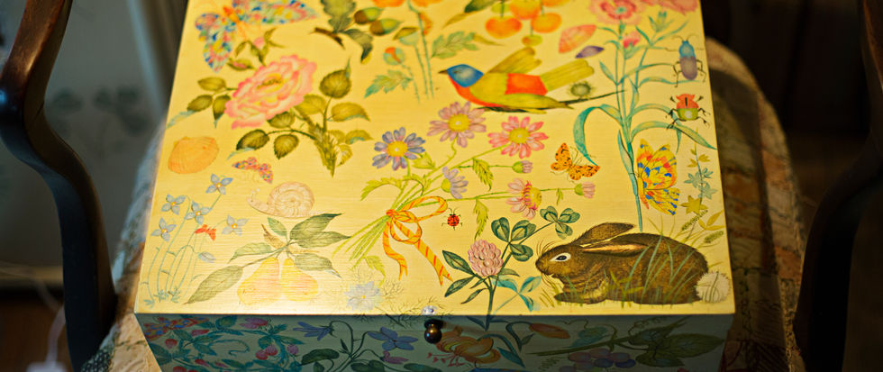 Virginia "Jinny" Clark (1913-1979) was a decorative painter known for her whimsical, richly detailed designs. Her artistic journey began in 1945 with a hand-painted child's bed and soon expanded to include murals, furniture, trays, and other everyday objects. After moving to Hudson in the 1930s, she became a beloved part of the local arts community. Following the death of her husband, she turned her passion into a profession, creating playful, nature-inspired scenes with brilliant Thalo paints and delicate brushwork. Jinny also brought her artistic flair to Western Reserve Academy, where she worked in the library and crafted imaginative displays. Her style-vibrant, textured, and distinctly her own-captured the joy and originality she brought to everything she touched.
